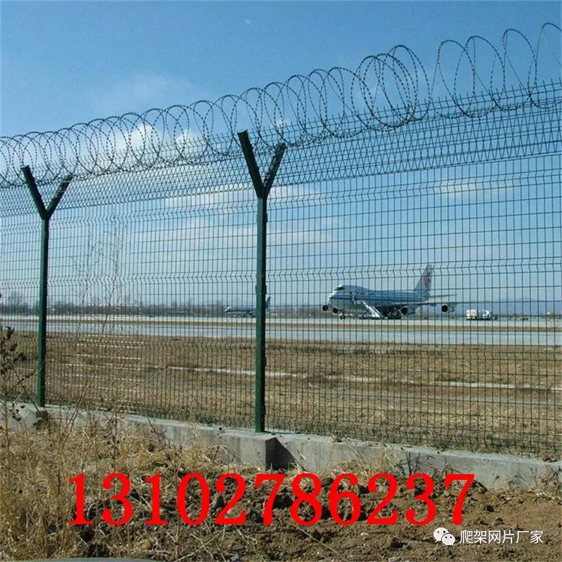 安平縣艾瑞金屬絲網(wǎng)有限公司生產機場隔離網(wǎng),飛機場圍界網(wǎng),機場圍欄網(wǎng)又稱作“Y型安全防御護網(wǎng)”,是由V型支架立柱,加強型焊接網(wǎng),安全防盜連接件和熱鍍鋅刀片刺籠組成強度和安全防御性級別很高。