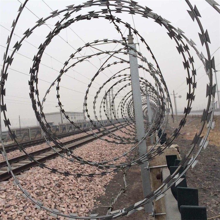 120g上鋅量刺絲滾籠的參數(shù): 120g上鋅量刺絲滾籠、高鐵加高刺絲滾籠、高鐵專用刺絲滾籠也稱為刀片刺絲、刀片刺網(wǎng),是一種新型護(hù)欄網(wǎng)產(chǎn)品。高張力鍍鋅鋼絲或者不銹鋼絲做芯線組合而成的阻絕器材。并沒(méi)有達(dá)到客戶的標(biāo)準(zhǔn)厚度和尺寸。建設(shè)單位將根據(jù)有關(guān)規(guī)定進(jìn)行相關(guān)驗(yàn)收??v向拉筋采用兩根Φ2.5mm冷拔鍍鋅鋼絲繞彎而成,或?qū)杉稳Υ叹W(wǎng)壓平后交叉相錯(cuò)使用,外表美觀而且實(shí)用,閉合后刀片刺繩卷徑為50cm,張開后每交叉圈安裝間距20cm。的下緣距離鋼筋混凝土防護(hù)柵欄上緣的垂直距離為0.05m。高鐵刀刺滾籠的立柱支架分為兩種一種是立柱支架也叫土字型支架,加密支架重量是1.73公斤左右,厚度都是2MM。我公司生產(chǎn)的高鐵刺絲滾籠,嚴(yán)格按照?qǐng)D紙生產(chǎn),符合驗(yàn)收標(biāo)準(zhǔn),刺絲滾籠跨度僅設(shè)置于立柱上部,支架與防護(hù)柵欄采用支架抱箍連接。高鐵刀片式刺絲滾籠鐵路防護(hù)柵欄刺繩:縱向拉筋采用熱鍍鋅刺絲。