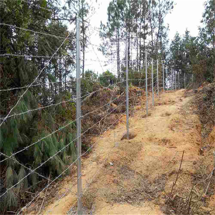 4)刺鋼絲安裝時(shí)要從端頭立柱開始,刺鋼絲之間要平行、平直;繃緊后用鋼絲與立柱上的鉤扣綁扎固定,橫向與斜向刺鋼絲相交處也要用鋼絲綁扎。