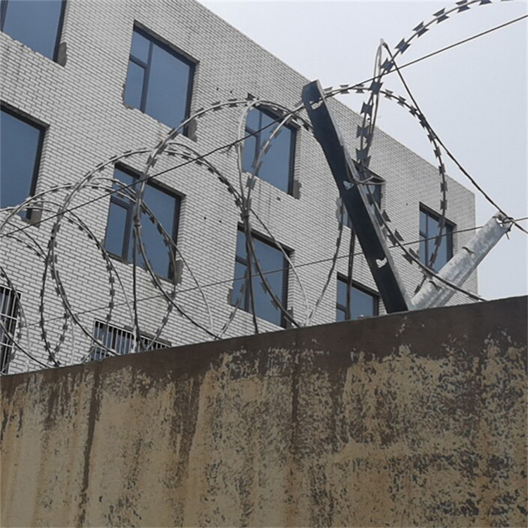 (4)支架在圍墻上的固定方法一般為底盤打膨脹螺絲固定。固定好后,方可進(jìn)行蛇腹形刀刺網(wǎng)安裝。