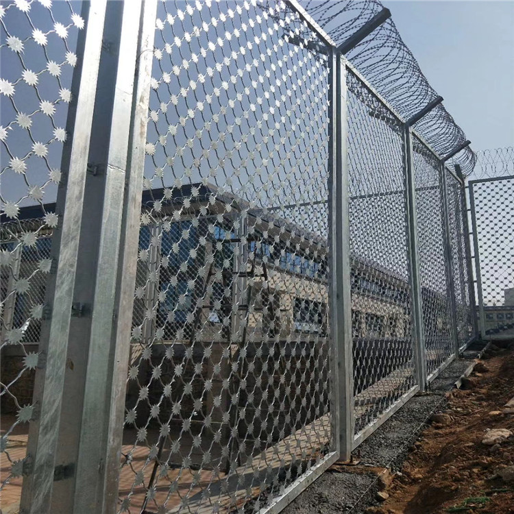 梅花型隔離網(wǎng)是是專門給司法系統(tǒng)設(shè)計的一種防爬、防脫逃的金屬隔離網(wǎng),網(wǎng)片有采用刀刺網(wǎng)片、梅花刺網(wǎng)片、鋼絲焊接網(wǎng)片等樣式,立柱采用Y型立柱,上面加裝刀刺滾籠,防御級別很高。近年來一直被廣泛應(yīng)用于監(jiān)獄、看守所、戒毒所、軍事基地等高安全場所。表面處理采用電鍍、熱鍍、噴塑、浸塑等防腐形式,具有很好的防腐、抗曬、耐候等特點(diǎn)。其造型美觀.