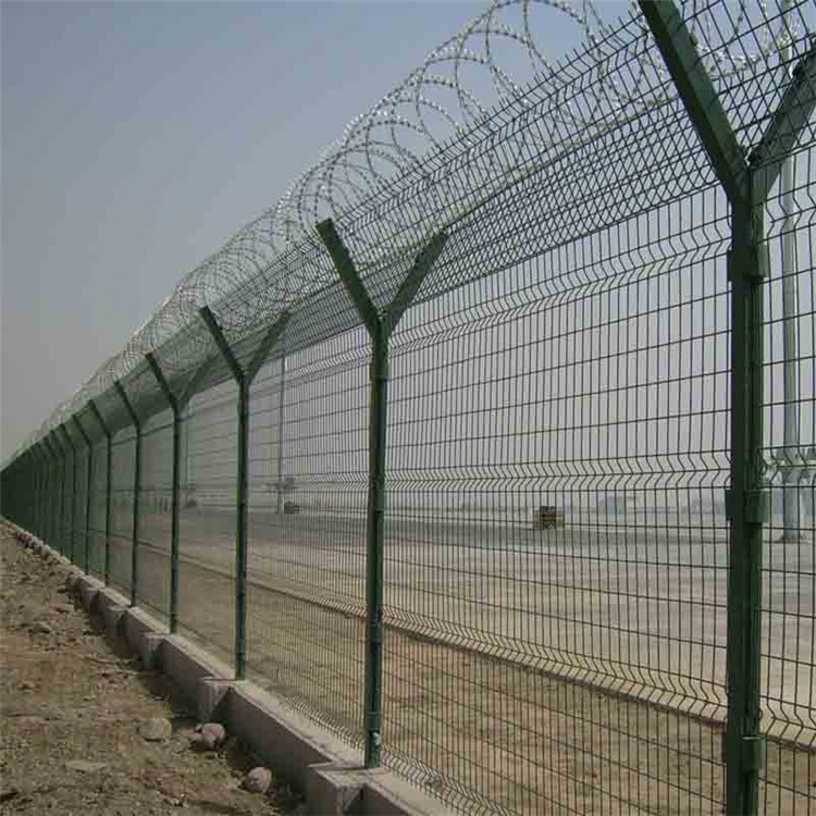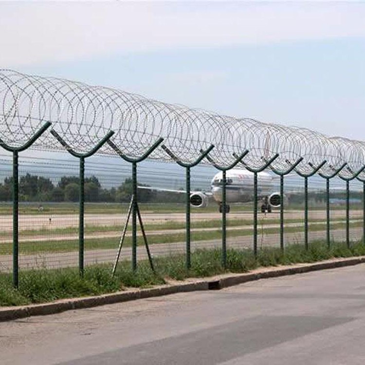 機(jī)場護(hù)欄網(wǎng)又稱作“Y型安全防御護(hù)網(wǎng)”,是由V型支架立柱加強(qiáng)型焊接片網(wǎng),安全防盜連接件和熱鍍鋅刀片刺網(wǎng)組成強(qiáng)度和安全防御性級別很高。被廣泛應(yīng)用在機(jī)場,基地等高安全場所。