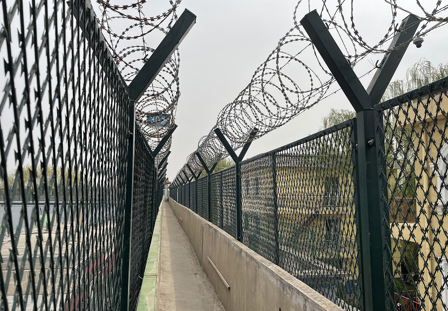 監(jiān)獄Y型鋼網(wǎng)墻,主要是采用頂部防爬刀片刺網(wǎng)與高強度防護網(wǎng)的結(jié)合,由V型支架立拄,加強型焊接片網(wǎng),安全防盜連接件和刀片刺網(wǎng)組成。具有嚇阻、防翻越等效果,材質(zhì)堅硬,高強度,高張力,造型設(shè)計獨特,不宜觸摸,因而能達到極好的防護隔離效果