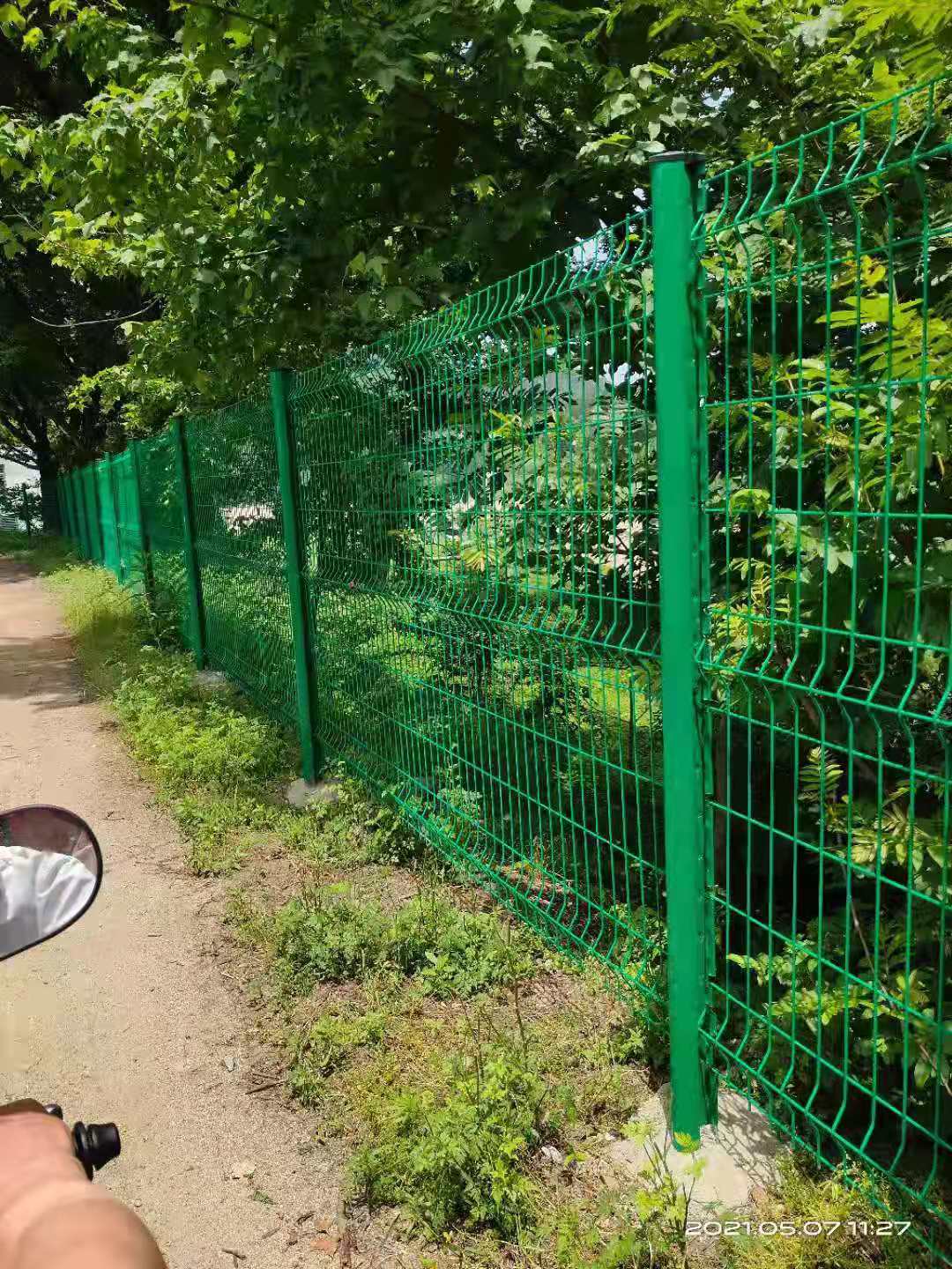 園區(qū)護(hù)欄金屬圍網(wǎng)之雙邊絲圍網(wǎng):絲徑3.0-4.0mm、孔徑75*150mm、80*160mm、尺寸1.8*3m、立柱48圓管。