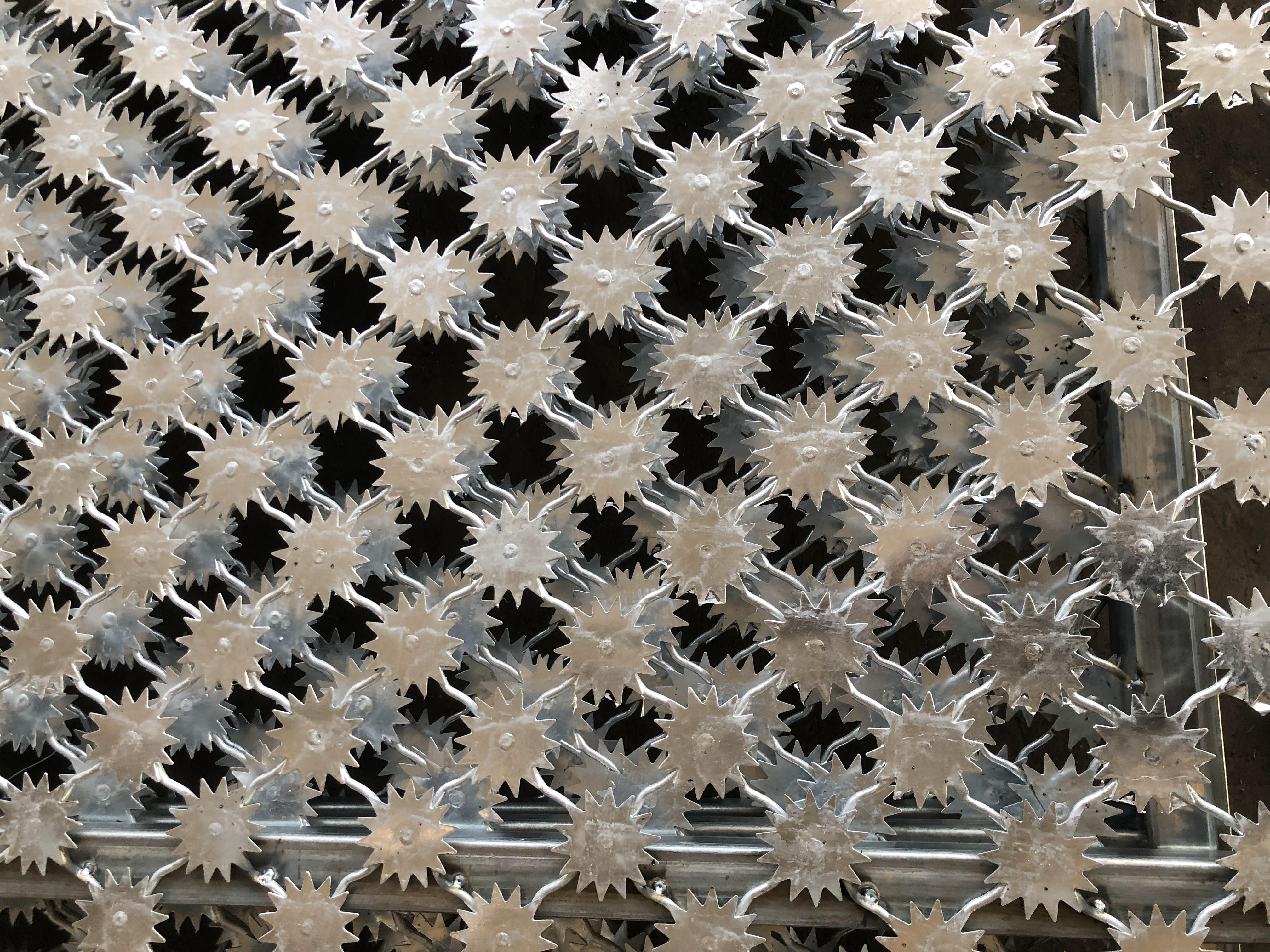 監(jiān)獄防沖撞網(wǎng)梅花刺鋼網(wǎng)墻的梅花刺形狀一般為各種不同角度的倒V字型或Z字型刺,刺的尖端非常銳利,以增加其防切割能力。梅花刺的刺距按照不同的需求可在5厘米到20厘米之間調(diào)節(jié),以實現(xiàn)不同的安防防范目標。