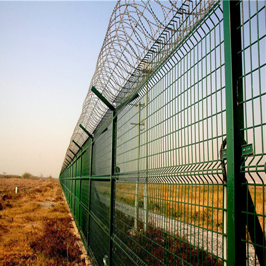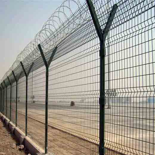 機(jī)場(chǎng)圍界網(wǎng)的國際標(biāo)準(zhǔn),主要包含以下方面:圍界網(wǎng)片及V型網(wǎng)的網(wǎng)孔其相鄰橫絲間距不得大于10cm,豎絲間距不得大于5cm,機(jī)場(chǎng)圍界網(wǎng)片與立柱之間的縫隙不得大于2mm,網(wǎng)片離地間距不得大于2cm。焊接圍界網(wǎng)片的鋼絲直徑必須大于等于5mm。機(jī)場(chǎng)圍界網(wǎng)的立柱應(yīng)采用60*60mm方管制成,管壁厚度不得低于2mm,立柱及網(wǎng)片的表面防腐年限不能低于8年。