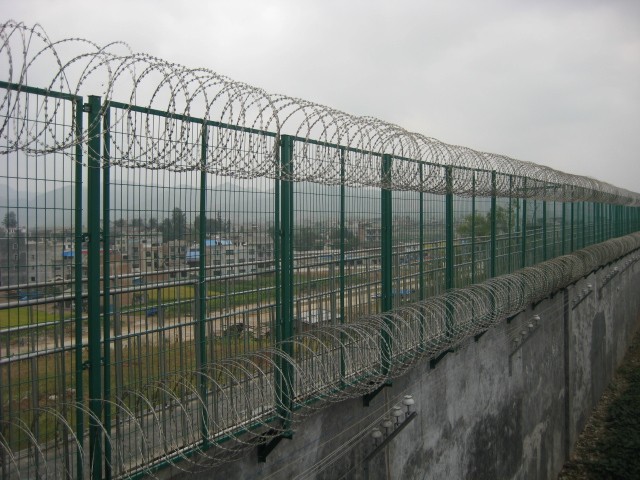 監(jiān)獄鋼網(wǎng)墻主要是采用高強(qiáng)度的刀片刺網(wǎng)與普通防護(hù)網(wǎng)的分離,由V型支架立拄,增強(qiáng)型焊接片網(wǎng),平安防盜銜接件和刀片刺網(wǎng)組成。刀片刺網(wǎng)是一種新型防護(hù)網(wǎng),由銳利尖角鍍鋅鋼板或不銹鋼薄板做刀片,鋼絲做芯線組合而成的防護(hù)器材。