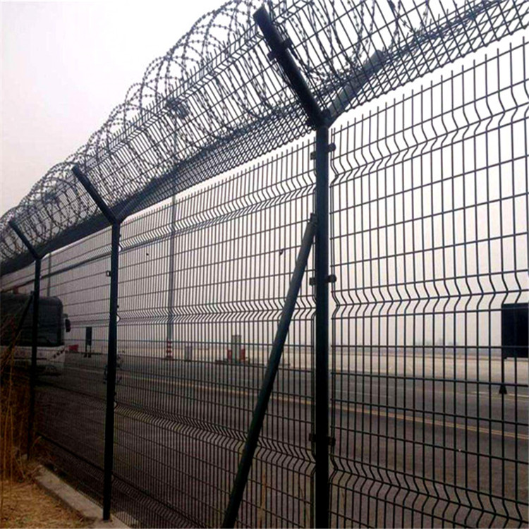 特點(diǎn):如果在機(jī)場(chǎng)護(hù)欄網(wǎng)頂部加裝刀片刺絲、刀片刺繩后又很好的增強(qiáng)了安全防護(hù)性能。采用電鍍、熱鍍、噴塑、浸塑等防腐形式,具有很好的抗老化、抗曬、耐候等特點(diǎn)。其產(chǎn)品造型美觀、花色多樣,既起到圍欄作用,又起到美化作用。由于具有安全性高、防攀爬能力好,網(wǎng)片連接方式采用特制SBS緊扣件,有效防止人為的破壞性拆卸,橫向四道折彎加強(qiáng)筋,使網(wǎng)面強(qiáng)度顯著增加。