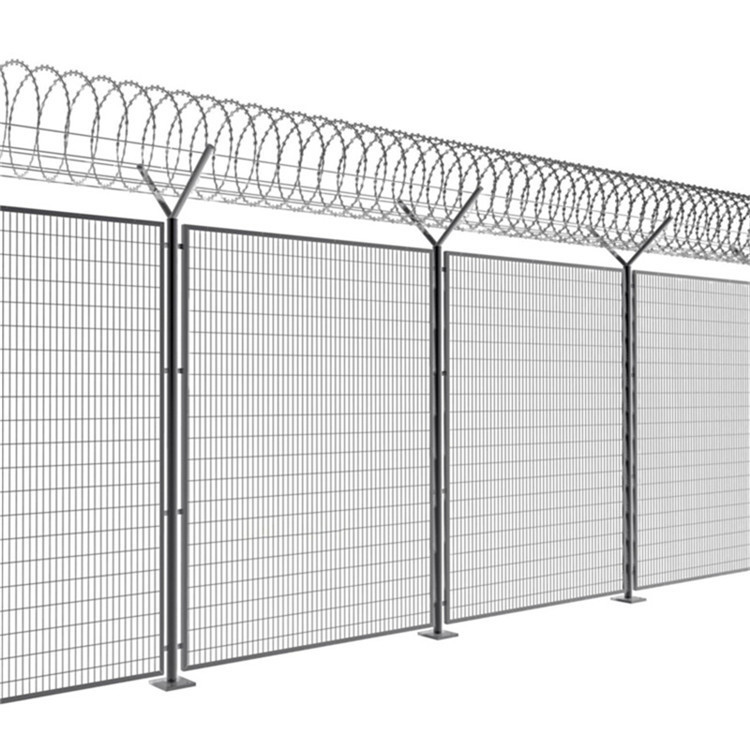 監(jiān)獄鋼網墻安全網又稱作“Y型安全防御護網”,是由V型支架立柱加強型焊接片網,安全防盜連接件和熱鍍鋅刀片刺籠組成,強度和安全防御性級別很高。近年來被廣泛應用在監(jiān)獄,軍事基地等高安全場所。注如果在監(jiān)獄護欄網頂部加裝刀片刺絲、刀片刺繩后又很好的增強了安全防護性能。采用電鍍、熱鍍、噴塑、浸塑等防腐形式,具有很好的kang老化、kang曬、nai候等特點。