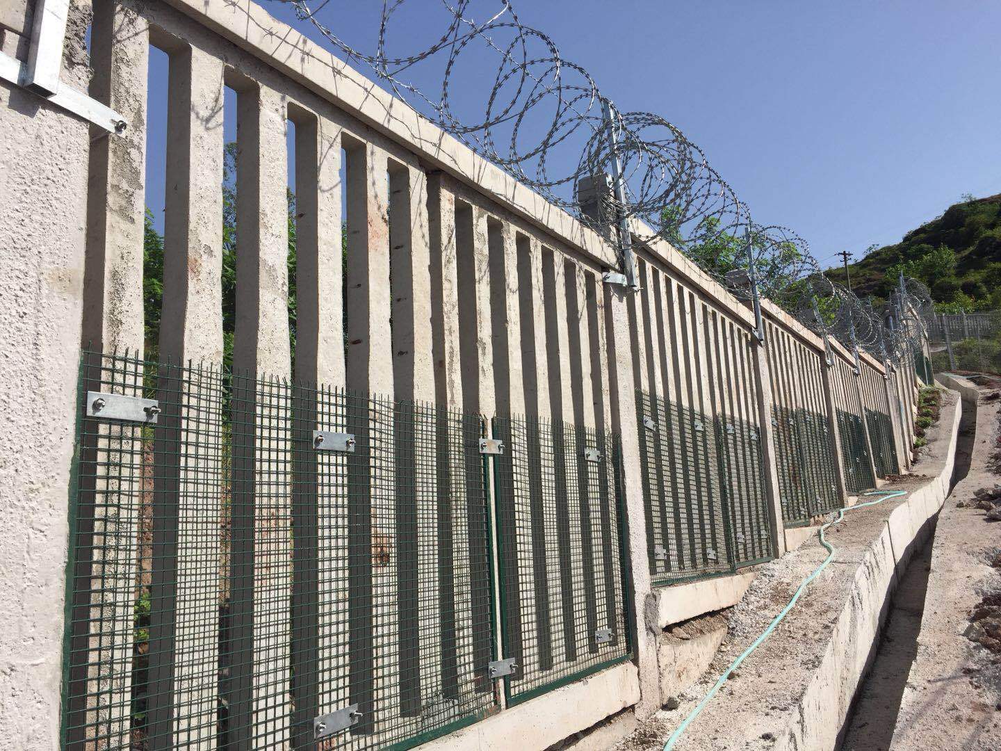 (4)、刺絲滾籠的下緣距離鋼筋混凝土防護(hù)柵欄上緣的垂直距離為0.05m。