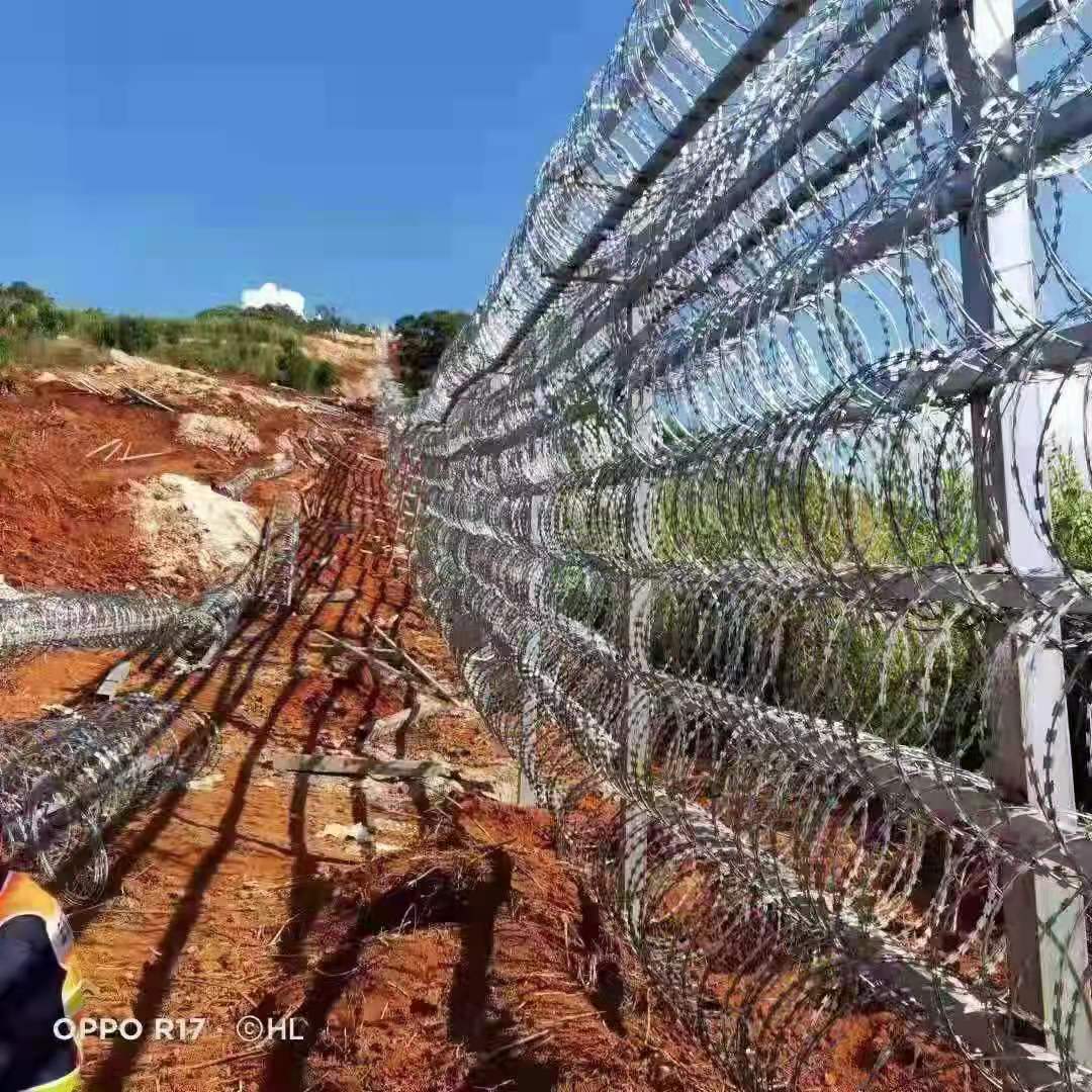 一圈一圈鐵絲上有鋒利的小刀片,強(qiáng)闖的話會(huì)在皮膚上劃開很多小口,不及時(shí)救治就會(huì)傷口感染、嚴(yán)重的是流血過多而死。一般情況下,想要快速通過這個(gè)鐵絲網(wǎng),需要使用爆破筒,但是這會(huì)驚動(dòng)邊防官兵。用鉗子慢慢剪也可以,但是監(jiān)控設(shè)備和無人機(jī)會(huì)發(fā)現(xiàn)。而且我國的蛇腹型鐵絲網(wǎng)是立在柵欄上面的,剪的話會(huì)很難操作,耗時(shí)耗力