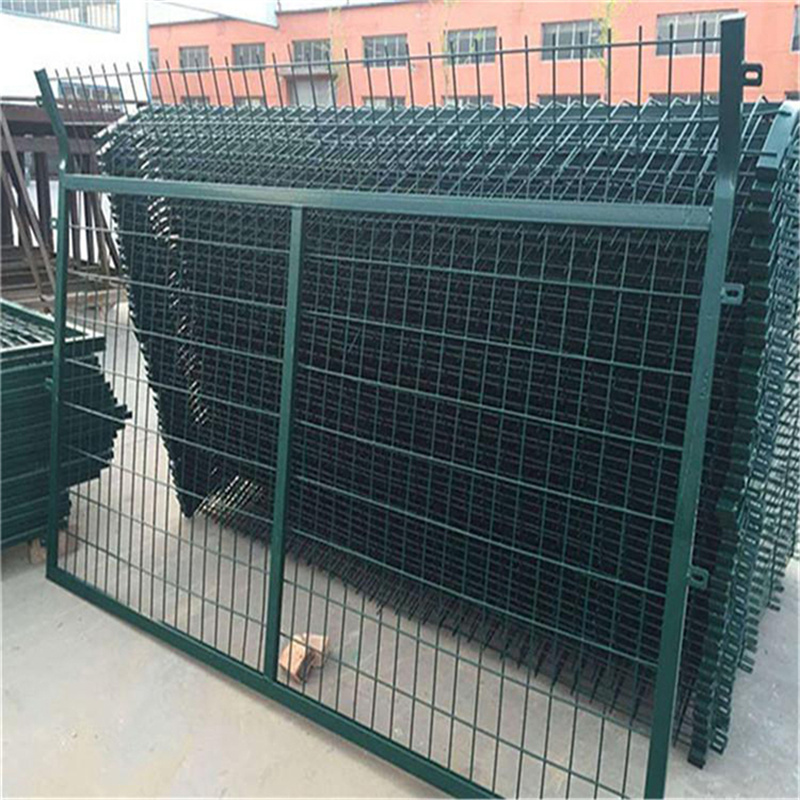 鐵路兩側(cè)防護(hù)柵欄為冷拔鋼絲點(diǎn)焊熱浸塑網(wǎng)片,外型尺寸為2760*1790mm,網(wǎng)格尺寸為75*150mm,鋼絲為φ4mm , 網(wǎng)片邊框采用20*30*1.5mm的方管焊接而成,網(wǎng)片連接片由40*40*4mm鋼片制作,防盜螺栓的螺柱、螺帽、墊圈等作熱鍍鋅處理。鐵路兩側(cè)防護(hù)柵欄網(wǎng)片表面采用熱浸塑處理,顏色為墨綠色,整個(gè)結(jié)構(gòu)表面平整光滑,色澤均勻,無漏鍍、開裂、脫皮及脫落等缺陷。網(wǎng)片浸塑所用的材料及PE表層環(huán)保性好,無污染。