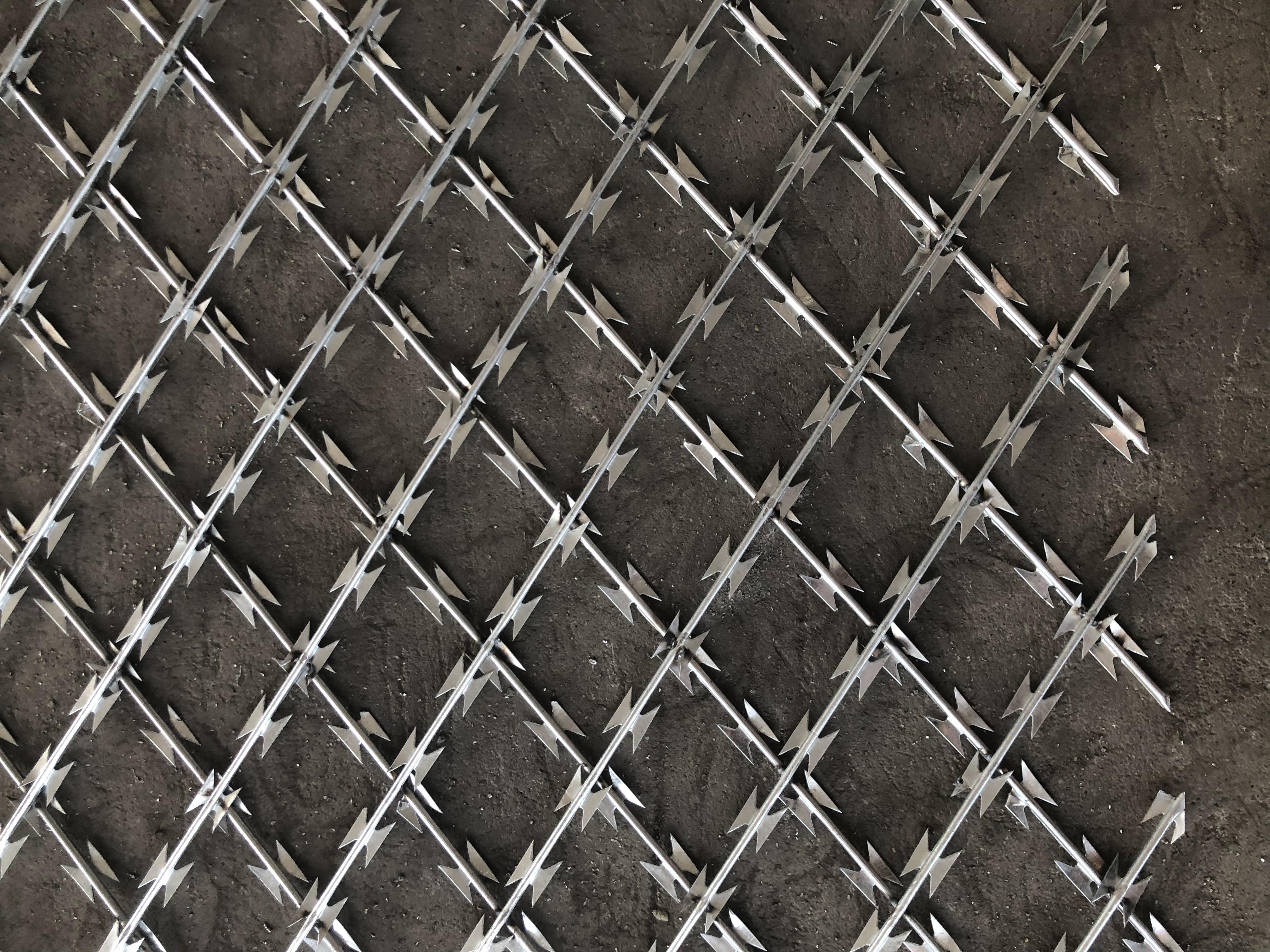 監(jiān)獄菱形焊接刀刺網使用刀片刺繩焊接來的網片, 是把刀片刺絲焊接成菱形孔或者方形孔的刺網,如果有人想攀爬翻越,網狀的刀片刺絲刀片鋒利,手不能握,腳不能攀登,堅決阻止人逾越的防護墻,具有很強的恐嚇和阻止效果,既美觀又實際效果顯著.焊接的刀片刺絲,深受監(jiān)獄、軍隊、保密組織的喜好。