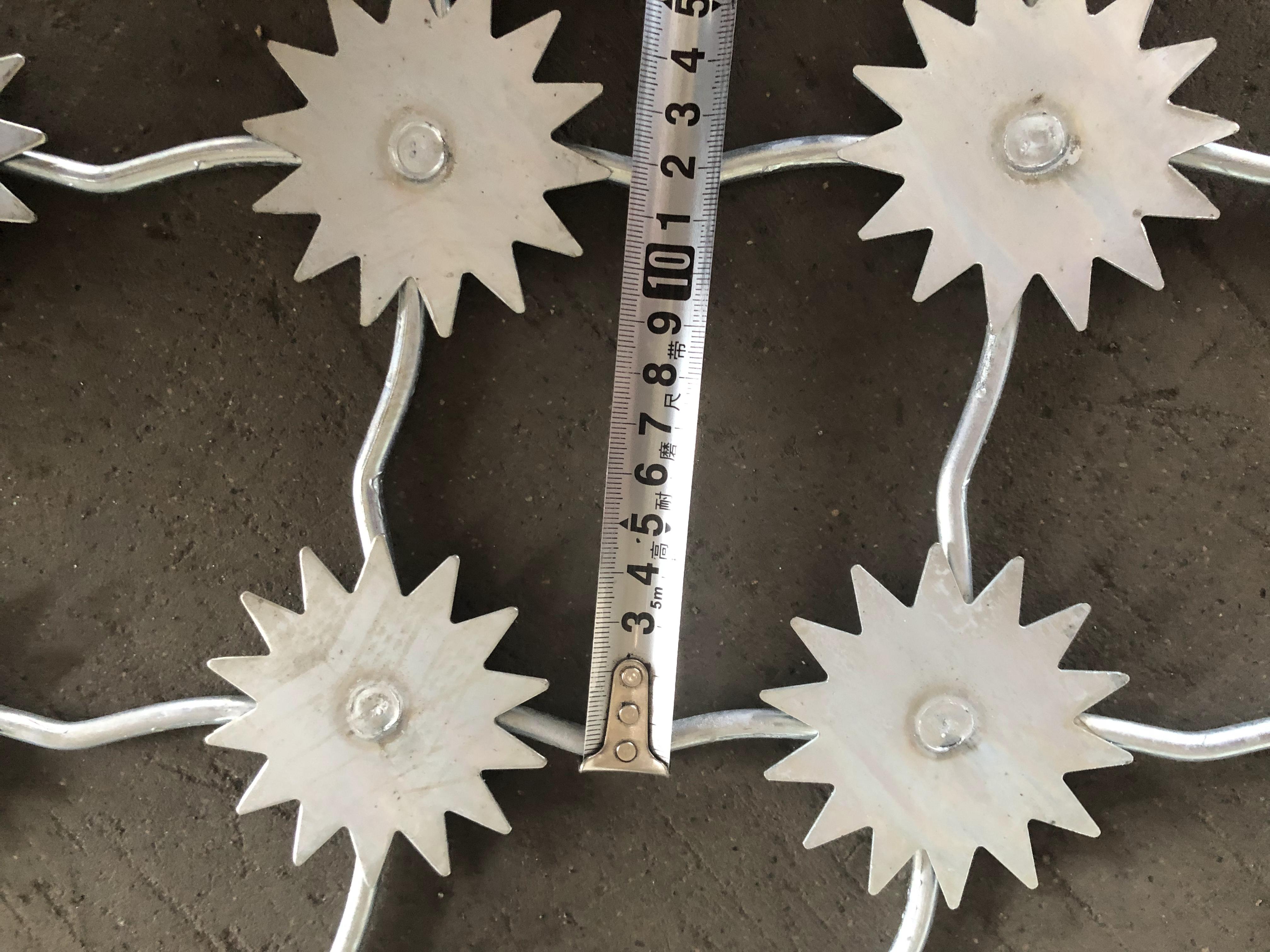 雪花刺片隔離網(wǎng):是用氬弧焊將梅花形刺片焊接在美格網(wǎng)的節(jié)點(diǎn)上,形成刺形保護(hù),有效的防止了手握腳攀。