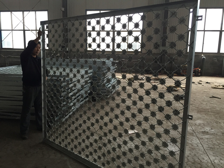 雪花刺片隔離網(wǎng)主要應(yīng)用于:監(jiān)獄隔離網(wǎng)、機(jī)場(chǎng)圍界、軍事設(shè)施、電力配電站、邊防線、邊防哨所等地的高安全隔離,具有防攀爬、抗剪切、高安全防護(hù)性能。