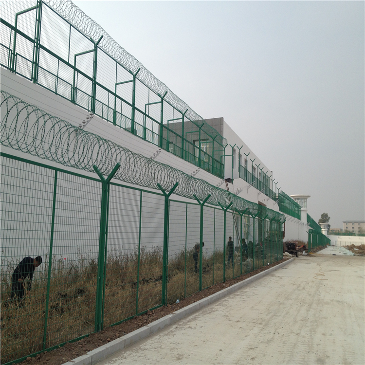 監(jiān)獄護欄網(wǎng)、監(jiān)獄鋼網(wǎng)墻、監(jiān)獄圍欄這三個叫法實際上就是一種產(chǎn)品,每個地區(qū)的叫法按不同,都是監(jiān)獄看守所安裝的一種防護網(wǎng),材質(zhì)一般采用Q195低碳鋼絲焊接成所需尺寸的網(wǎng)片大小,一般每片規(guī)格有2米x2.5米,2.5米x3米,1.8米x2米等各種尺寸,客戶可根據(jù)要求選購,成型的網(wǎng)片一般都是沒有經(jīng)過表面處理的黑片,有些是需要焊接邊框的,有些是直接焊成雙絲的,在經(jīng)PVC浸塑處理,PVC浸塑是通過加熱浸塑液放入監(jiān)獄護欄網(wǎng)、監(jiān)獄鋼網(wǎng)墻、監(jiān)獄圍欄的黑絲網(wǎng)片及立柱使之冷卻后塑料包覆在護欄網(wǎng)表面。這種工藝有無需模具、加工成本低、成型容易、具有豐富的色彩,良好的防護性,優(yōu)異的耐寒保溫性以及抗酸堿性等特點被廣范使用,顏色可選草綠色,墨綠色這兩款是最常用的。