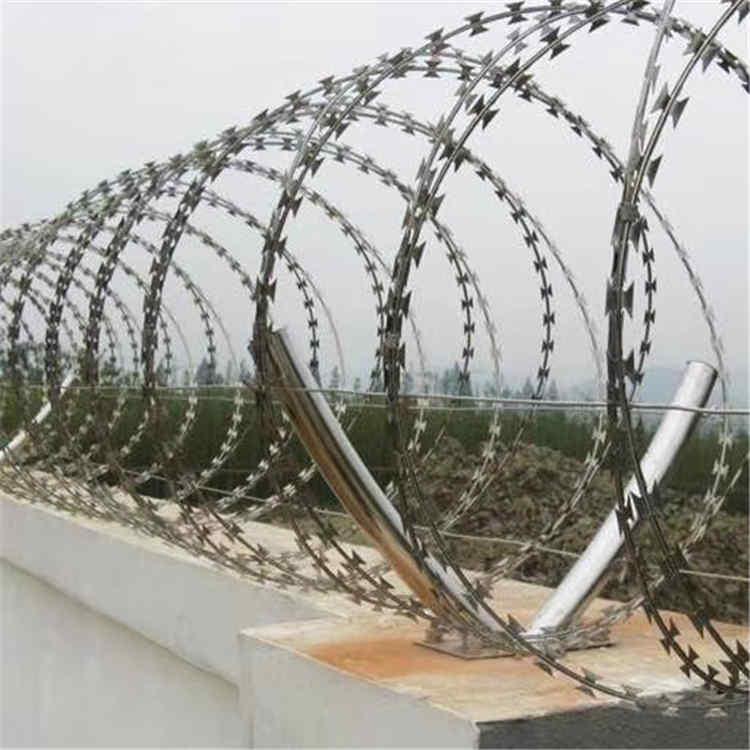 第二種,在安裝的過程,可根據(jù)圍墻的長度設(shè)計(jì)需要使用多少根Y字支架,一般以5-10cm的間距為好,把Y字型支架固定在圍墻上面,其中Y字形支架可根據(jù)您的實(shí)際情況進(jìn)行打孔,以此為了安裝刀刺網(wǎng)的時(shí)候起到固定的作用。然后刀刺網(wǎng)的Y字支架上兩邊各拉一根鋼絲,對刀刺網(wǎng)加以固定,以免左右搖晃。