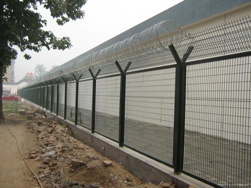 監(jiān)獄防逃網(wǎng)墻加高網(wǎng)通常采用鋼絲直徑為5mm、6mm、6,5mm ,網(wǎng)孔采用50mm*100mm、50mm*50mm、 50mm* 200mm、