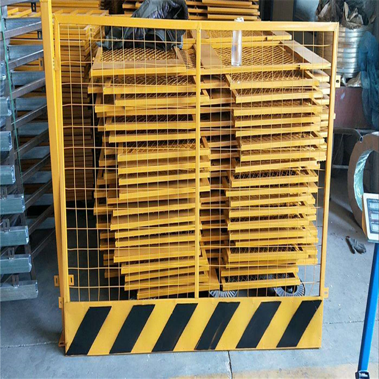 門栓采用鍍鋅成套工藝門栓,外形美觀,使用方便。施工電梯井防護(hù)門栓設(shè)計在外面,只能由電梯操作人員開關(guān)防護(hù)門,有效防止樓層內(nèi)等候人員打開防護(hù)門,杜絕高空拋物和高空墜落的潛在施工風(fēng)險。門面采用小孔鋼板網(wǎng)或電焊網(wǎng)片與鋼板組合構(gòu)成,一方面可以防止等候人員伸手開門,又便于人貨電梯操作人員觀察樓內(nèi)情況,利于樓內(nèi)外雙方工作人員溝通交流。高強(qiáng)冷軋鋼板可以抗擊300kg以上的沖擊力。并且噴涂警示語和擋腳警示線,對工地文明施工形象顯著提升。門軸采用16#圓管焊結(jié)而成,大大簡化安裝程序,只需在外架鋼管立桿上與門軸相對應(yīng)位置焊接90度直角圓鋼,把防護(hù)門掛上既可以使用,拆卸也同樣方便。