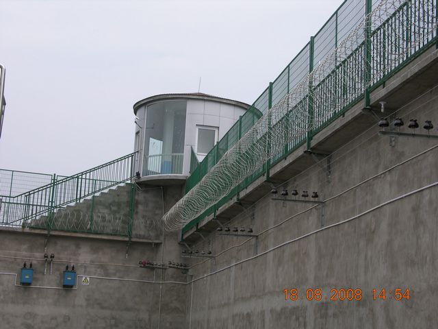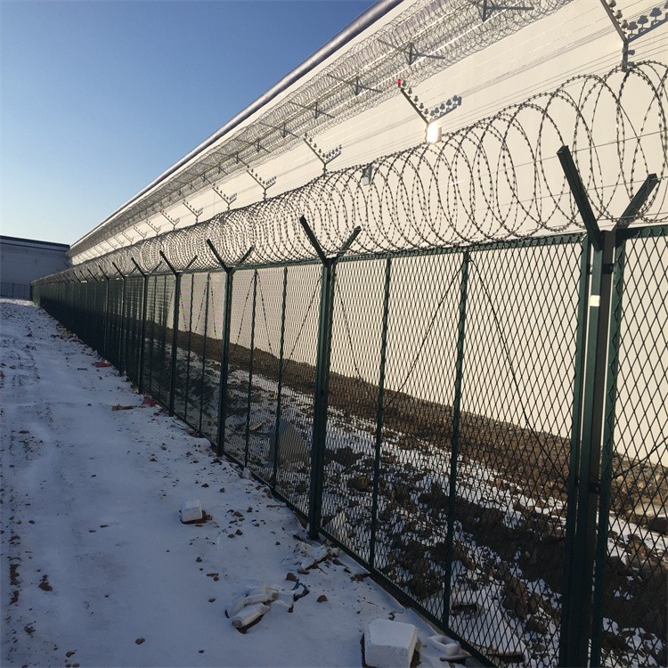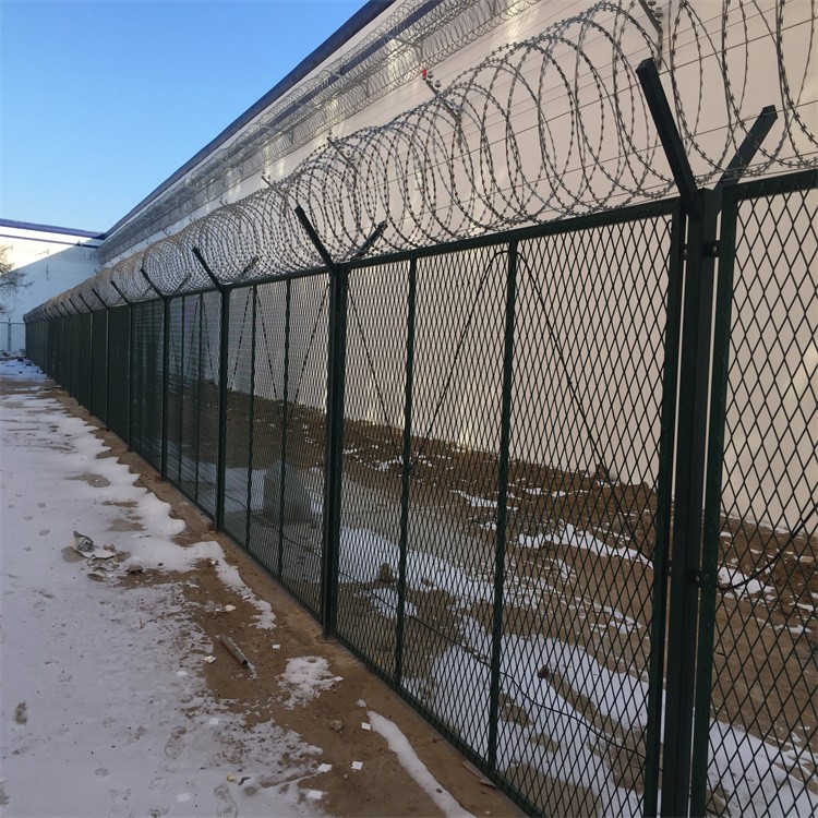 監(jiān)獄鋼網(wǎng)墻也叫Y型安全防御網(wǎng),是由V型支架立柱、 加強焊接網(wǎng)片、防盜連接件和熱鍍鋅蛇腹式刺絲滾籠組成的安全防護性能很高的護欄
