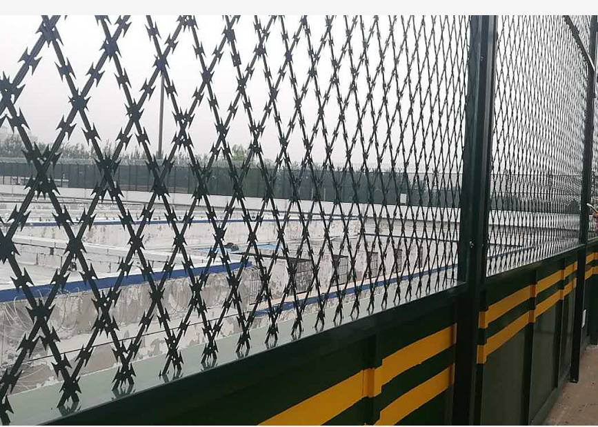 監(jiān)獄菱形焊接刀刺網(wǎng)中間焊接的刀片刺網(wǎng)和蛇腹網(wǎng)結(jié)合使用,使人望而卻步,擊破人的僥幸心理。