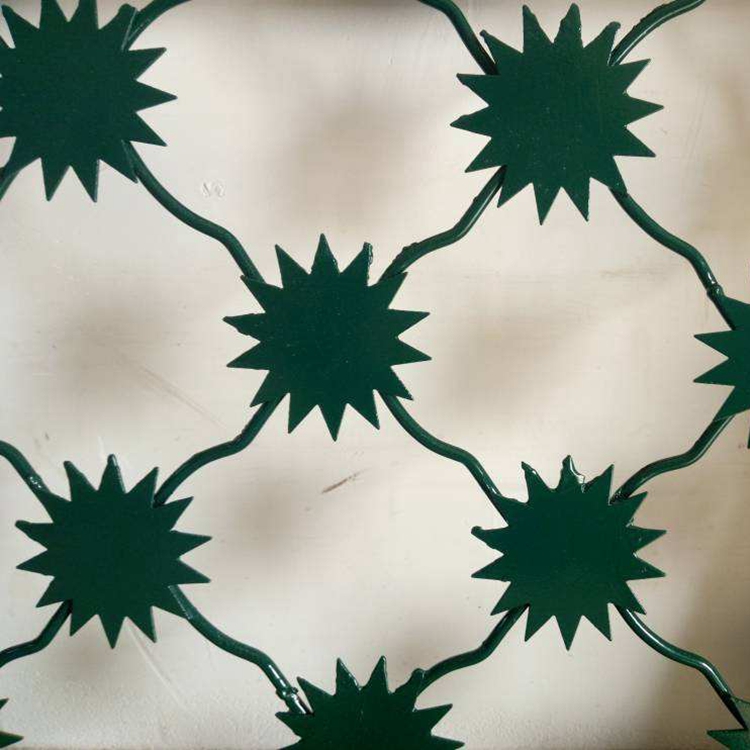 監(jiān)獄梅花刺網(wǎng)防攀爬能力強(qiáng)主要是因?yàn)樗忻坊ㄐ螤畹拇?,太陽花形狀設(shè)計此設(shè)計不僅美觀大方,而且具有極強(qiáng)的防護(hù)力。太陽花防護(hù)網(wǎng)中每個花瓣都是由網(wǎng)的橫、豎兩根主鋼筋相交截割制成,花心及花干部分則為輔助鋼筋固定,將網(wǎng)格尺寸調(diào)整、加強(qiáng)牢固。因?yàn)閲娝艿乃軐颖容^薄,不會形象梅花刺的形狀,從而達(dá)到防攀爬效果。