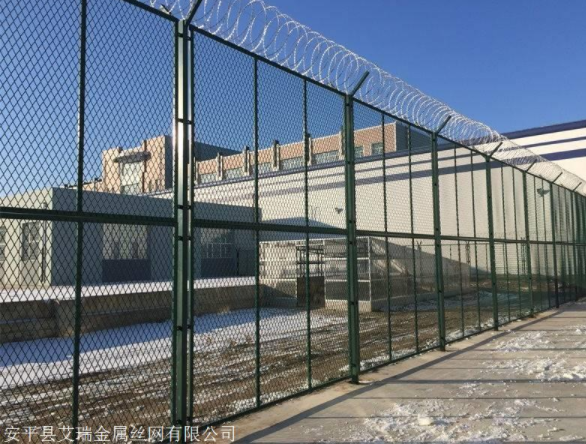監(jiān)獄防攀爬鋼網(wǎng)墻焊接的鐵絲網(wǎng)片形成75*150mm的網(wǎng)片至于上下螺旋刀片刺網(wǎng)的中間部分,安裝刀刺網(wǎng)的立柱采用60*60mm方管,壁厚在2一2.5mm ,高2.4米,底部2米圍直線,上部0.4米向內(nèi)折30度成斜線,立柱間隔為3米;長3米為一個單位:立柱表面涂黑綠色(注塑工藝) , 立柱配有連接件焊接的鐵絲網(wǎng)片和蛇腹網(wǎng)結(jié)合使用,使人望而卻步,擊破人的僥幸心理。