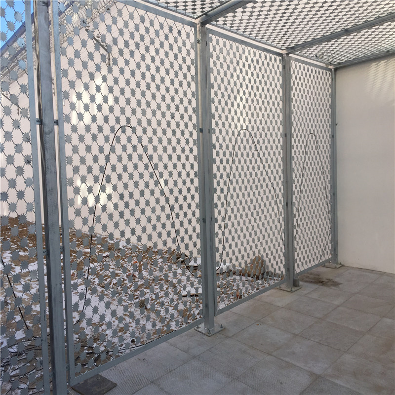 監(jiān)獄梅花刺鋼網(wǎng)墻又稱監(jiān)獄護(hù)欄網(wǎng)或監(jiān)獄隔離柵,主要是采用高強(qiáng)度的刀片刺網(wǎng)與普通防護(hù)網(wǎng)的結(jié)合,由V型支架立拄,加強(qiáng)型焊接片網(wǎng),安全防盜連接件和刀片刺網(wǎng)組成。刀片刺網(wǎng)是一種新型防護(hù)網(wǎng),由銳利尖角鍍鋅鋼板或不銹鋼薄板做刀片,鋼絲做芯線組合而成的防護(hù)器材梅花刺網(wǎng)又稱高安全防護(hù)網(wǎng)、監(jiān)獄防護(hù)網(wǎng),是用氬弧焊將梅花形刺片焊接在美格網(wǎng)的節(jié)點上,形成刺形保護(hù),有效的防止了手握腳攀,為此該鋼網(wǎng)墻在監(jiān)獄或看守所使用。