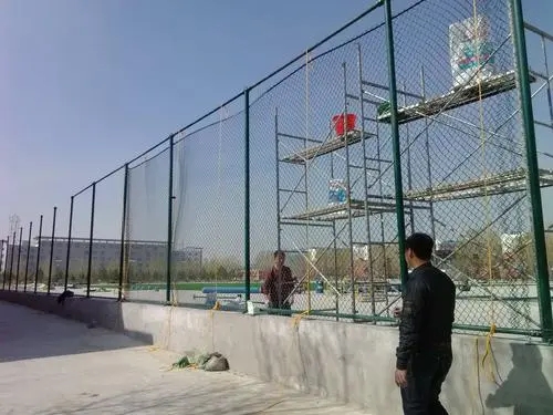 球場圍網(wǎng)安裝與步驟五、掛網(wǎng)片,球場圍網(wǎng)網(wǎng)片的固定方式分為扁鐵固定和鋼筋兩種固定方式,扁鐵固定方式是將扁鐵穿過勾花網(wǎng)四周,使用自攻釘先固定好上橫梁的網(wǎng)片,向下拉平網(wǎng)片,固定于下橫梁上左右同樣使用自攻釘進(jìn)行固定于立柱上;鋼筋穿插掛網(wǎng)方式是使用鋼筋穿過勾花網(wǎng)固定到圓管上的U型槽的鏈接裝置中,并使用螺釘固定好,上下左右均勻展開,具有一定的彈性。