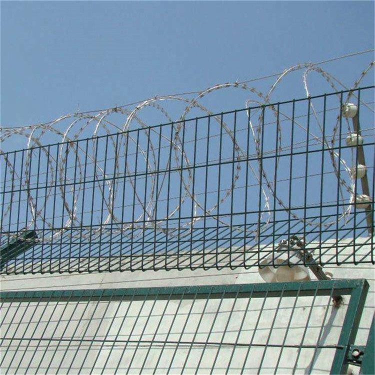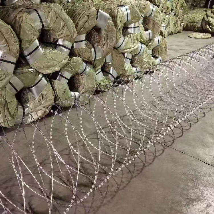 監(jiān)獄304不銹鋼防爬網(wǎng)用的不銹鋼蛇腹型刀刺網(wǎng)-般 304材質(zhì)的,防腐壽命長,不用像熱鍍鋅刀刺網(wǎng)需要勤更換的麻煩了。不銹鋼刀刺網(wǎng)直徑,常用500mm,600mm, 排列密度不小于10圈 /m,相鄰每圈間距不大于100mm;刀刺網(wǎng)刀片為304不銹鋼板沖壓的尖銳菱形,長度22mm,寬度1 5rm,厚度0.5mm;芯線為不銹鋼絲,線徑不小于2. 5mm,刀剌網(wǎng)與V型托架采用3道固定拉絲均勻固定,,扎絲采用1.2m304不銹鋼絲,固定拉絲采用8號鍍鋅鐵。