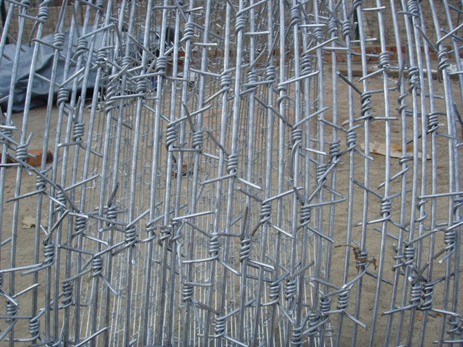 刺絲是組成刀刺網(wǎng)的主要原料,分為兩種,一種是普通刺絲,一種是刀片刺絲。普通刺絲主要是有兩根鐵絲交織在一起,然后每隔一定的距離用一根小刺絲擰在這兩根刺絲上,就成了刺花。刀片刺繩是有一個帶著對稱刀片的鐵皮,然后半包住鐵絲,不仔細觀察還以為是鐵絲上直接帶著對稱的刀片呢。