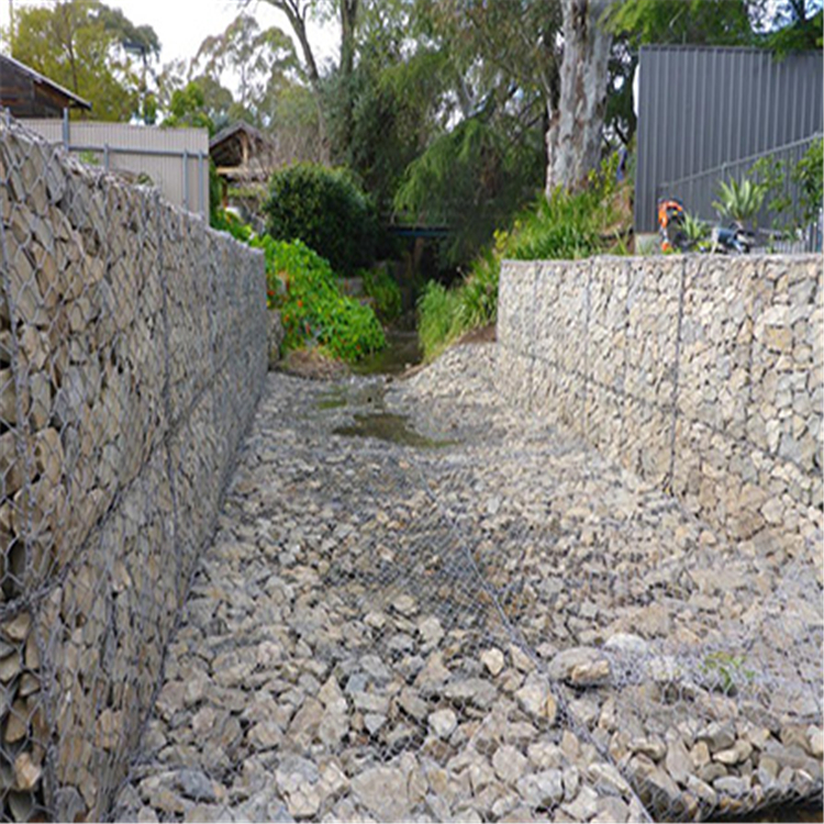 網(wǎng)箱結(jié)構(gòu)為石籠。根據(jù)ASTM和EN標(biāo)準(zhǔn),所用低碳鋼絲的直徑根據(jù)工程設(shè)計(jì)要求而變化。一般在2.0-4.0 mm之間,格賓網(wǎng)鋼絲抗拉強(qiáng)度不小于380kg/㎡,金屬鍍層重量一般大于245g/㎡,格賓網(wǎng)邊線直徑一般大于網(wǎng)線直徑。雙絞線部分的長度不應(yīng)小于50 mm,以確保線股部分的金屬涂層和PVC涂層不受損壞。河邊長期的雨水沖刷,很容易造成水土流失,山體滑坡。嚴(yán)重的河水沖刷河岸甚至造成的洪水,會造成大量財(cái)產(chǎn)損失和嚴(yán)重影響人民群眾的生命健康。因此,為了解決上述問題,網(wǎng)格生態(tài)網(wǎng)架結(jié)構(gòu)是較好的解決方案之一,它可以使河床和河岸得到長時間的保護(hù)。