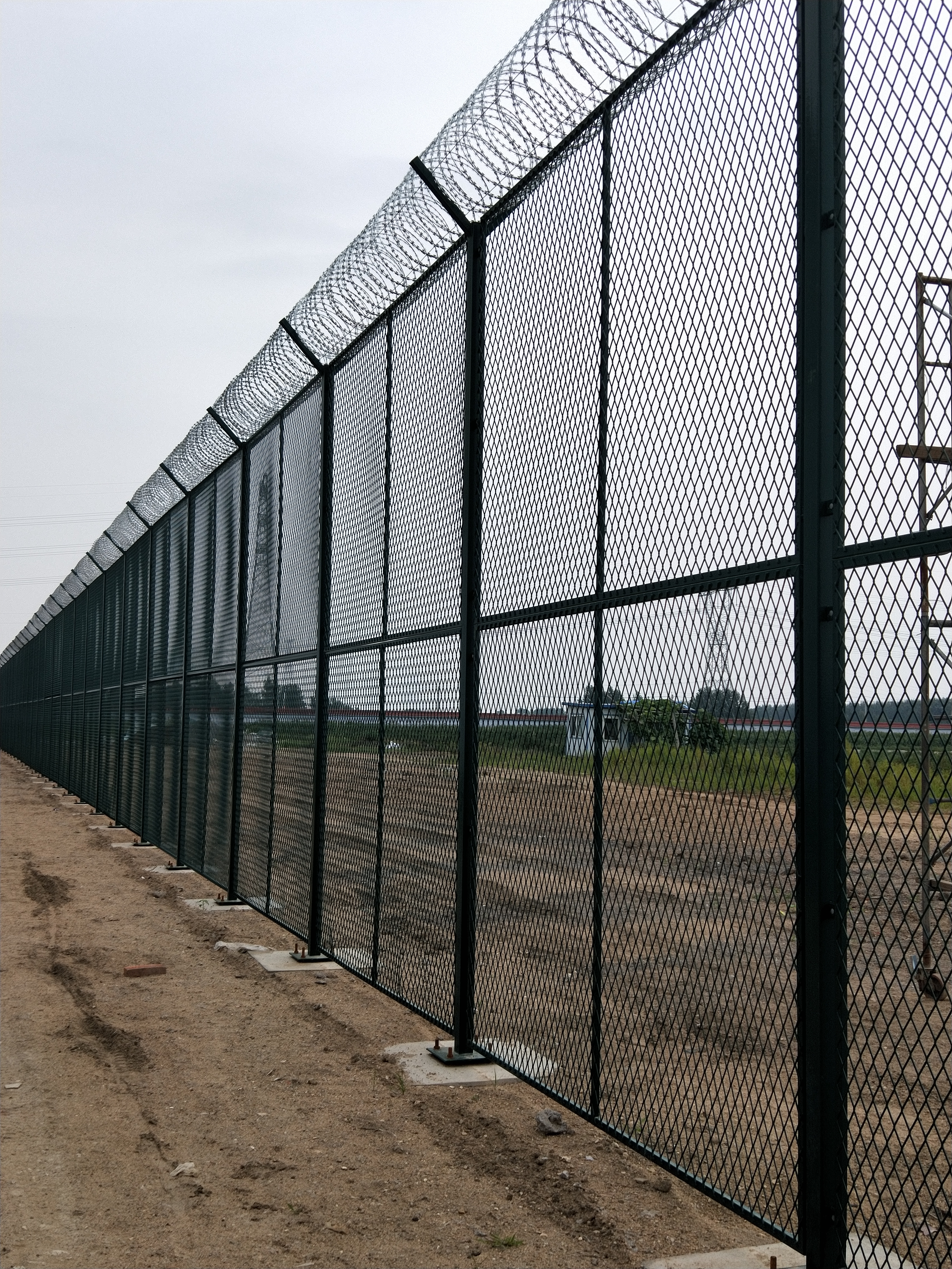 監(jiān)獄防護網(wǎng)又稱作“Y型安全防御護網(wǎng)”,是由V型支架立柱,加強型焊接片網(wǎng),安全防盜連接件和熱鍍鋅刀片刺籠組成強度和安全防御性級別很高。近年來,被廣泛應用在監(jiān)獄,軍事基地等高安全場所。(注:如果在監(jiān)獄護欄網(wǎng)頂部加裝刀片刺絲、刀片刺繩后又很好的增強了安全防護性能)。