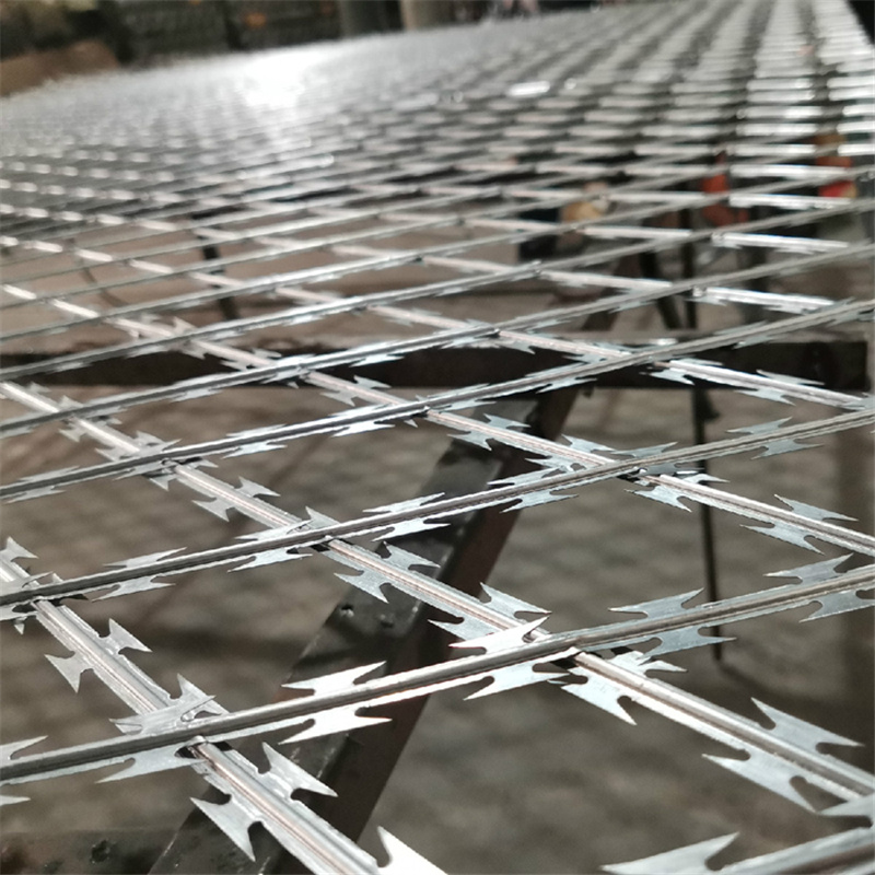 1、網(wǎng)片:寬約2500mm*高約2250mm;分上下兩層結(jié)構(gòu),總高約4.5米;上下層之間邊耳連接,確保網(wǎng)片不變形。 2、網(wǎng)孔及絲徑:高純度合金低碳鋼直線型刀刺圈:BTO一22型,蕊絲直徑2.5mm。刀長22mm,刀寬15mm,厚度0.5mm,刀間距35mm。規(guī)格約:70mm×150mm,橫筋與豎筋夾角60度角或120度角。3、網(wǎng)片固定框:40×20×2.0mm鍍鋅方鋼管。每網(wǎng)片框增加一道方管垂直中稱。固定邊框與刀片焊接網(wǎng)通過兩邊方鋼焊接連接,刀片焊接網(wǎng)居于固定邊框中間線,兩連接方鋼與刀片焊接網(wǎng)焊接于固定邊框中央;連接方鋼尺寸:15mmX2.5mm。