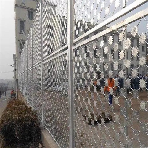 梅花刺網(wǎng)又稱(chēng)監(jiān)獄護(hù)欄網(wǎng)或監(jiān)獄隔離柵,主要是采用高強(qiáng)度的刀片刺網(wǎng)與普通防護(hù)網(wǎng)的結(jié)合,由V型支架立拄,加強(qiáng)型焊接片網(wǎng),安全防盜連接件和刀片刺網(wǎng)組成.刀片刺網(wǎng)是一種新型防護(hù)網(wǎng),由銳利尖角鍍鋅鋼板或不銹鋼薄板做刀片,鋼絲做芯線(xiàn)組合而成的防護(hù)器材梅花刺網(wǎng)又稱(chēng)高安全防護(hù)網(wǎng)、監(jiān)獄防護(hù)網(wǎng),是用氬弧焊將梅花形刺片焊接在美格網(wǎng)的節(jié)點(diǎn)上,形成刺形保護(hù),有效的防止了手握腳攀,為此該鋼網(wǎng)墻在監(jiān)獄或看守所使用。